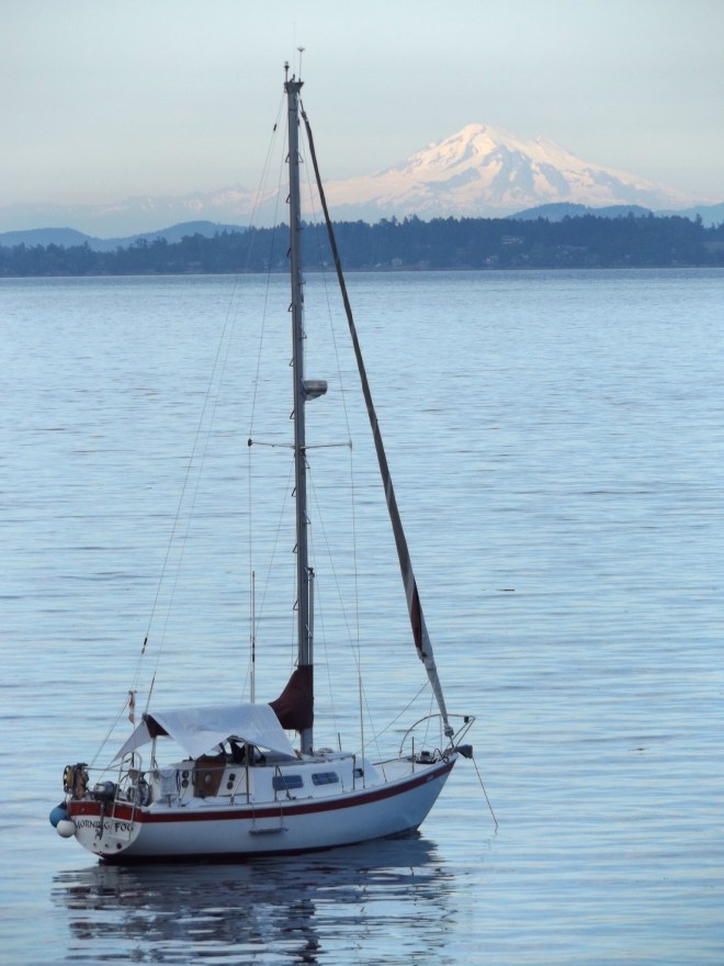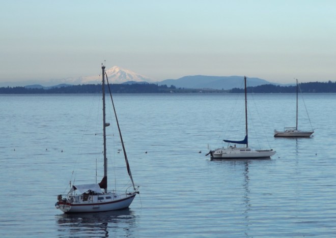 Mount Baker seemed to float, over in Washington state, and across the water from Vancouver Island. At the farthest reach of a camera zoom, it was barely there in the early afternoon sun. Can a mountain be a ghost? As the day wore on, a touch of colour changed the snowy slopes and the mountain was a little clearer. It was a lovely view on a lazy coastal afternoon, the sort of day that had us thinking about learning to sail.