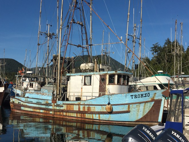 I give Scout a pat on the head for being a good dog on the docks, especially when we see harbour seals and river otters, and Mrs. PC gives a gentle shake of the head whenever we slow down at a particular vessel. The head shaking is a bit more emphatic each time we approach the Tromso. To be honest, I’m always surprised – and delighted – she’s still afloat. I don’t know if the price is falling in line with her water position. There’s a little less freeboard each passing season…