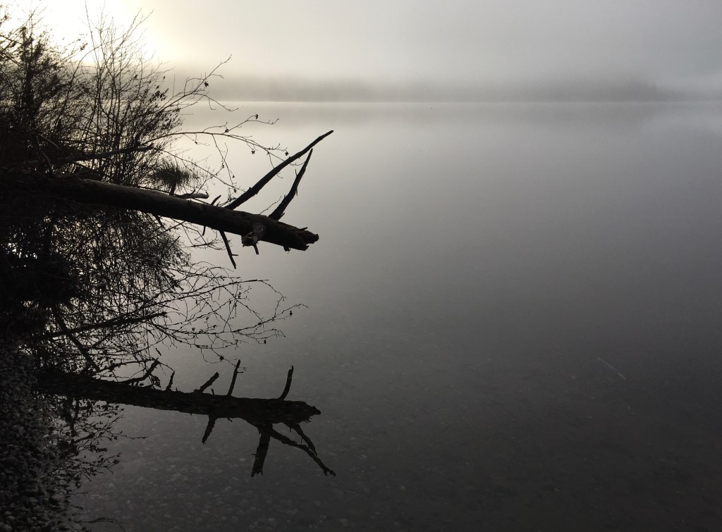 It was cold, and we walked at a brisk pace along the shore. Often, crows and ravens give us a squawk and a nod, and we sometimes see a heron in the reeds, but not much was stirring. The surface of the lake was still, and in places we couldn’t see where the water gave way to fog. It was very quiet, very calm. Dead calm, and no bad thing if you’re happy with that.