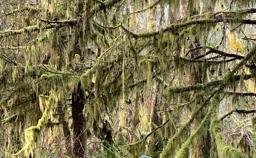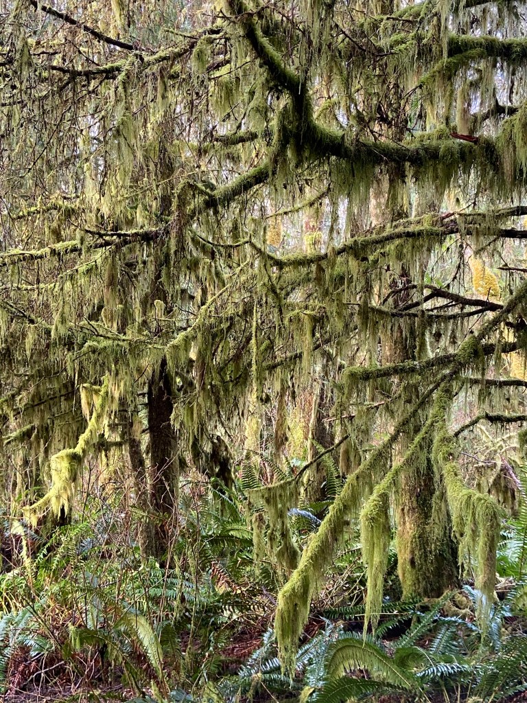 1. A delightful account, pc, of the perils, I mean joys, of a brisk spring walk. That hanging moss is really cool, you folks in the PNW have such incredible moss. And fun how you integrated the fringe talk in. I liked the part about sitting on a log and watching the other people go through what you went through. That’s a hiking/outdoor phenomenon that we don’t think about much, but is really interesting. Also liked the photos, espec. that one of the standing trees that have almost no limbs due to the battering wind. Cheers to all three of you, my friend.