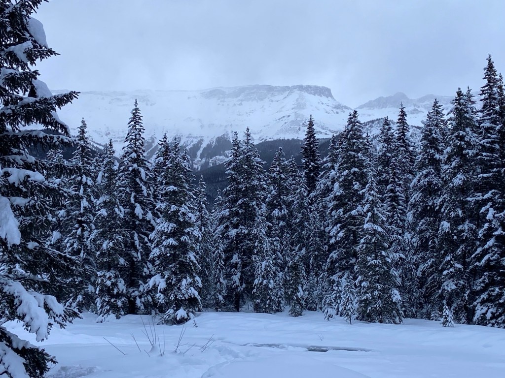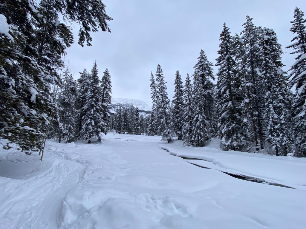 Poorly equipped for even a short walk as we were, we still enjoyed how silent and still (our mad stumbling aside) everything was. The blanket of snow was so pretty, muffling most noise. Winter mountain hush! Blessed quiet! We could just about hear the tinkling chuckle-gurgle of the creek, and, luckily, see it in a few places where it hadn’t been snowed over. Scout desperately wanted to get closer, odd for her, given she doesn’t enjoy the water, but we resisted her efforts. Sorry, Scout – wet feet and minus fifteen don’t mix!