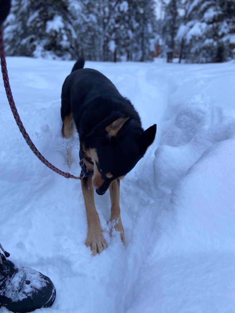 It was hard to see who was more gleeful to be out in the mountains, and to be running helter skelter through the deep snow, but I think Scout edged it. She was able to make slightly faster progress with four leg drive than we did on two. And yes, instead of dumping bags and heading straight out the door to explore the immediate surroundings, a short pause to don snow pants and snowshoes would have been sensible. Sensible? Nope, no time for that!