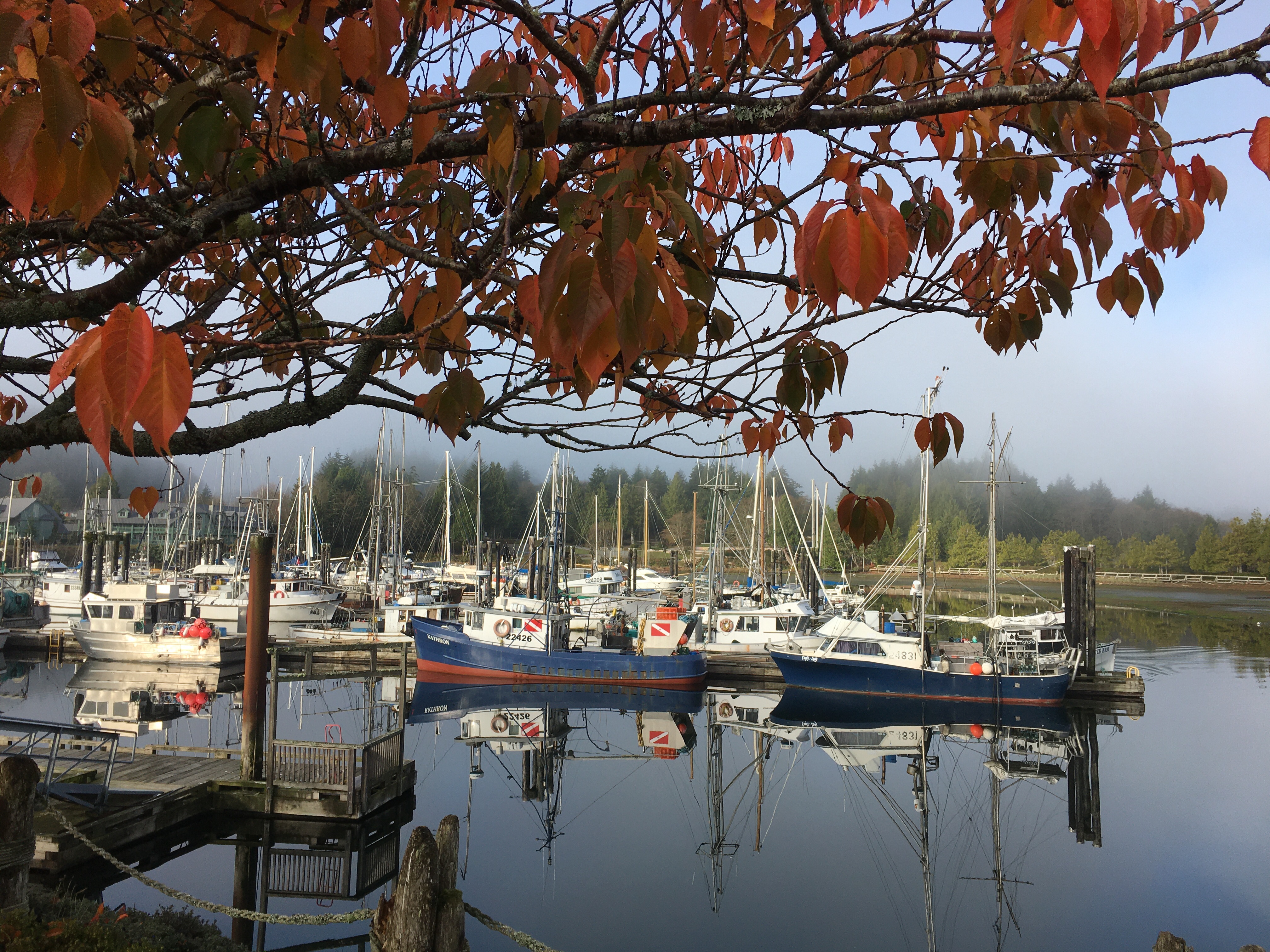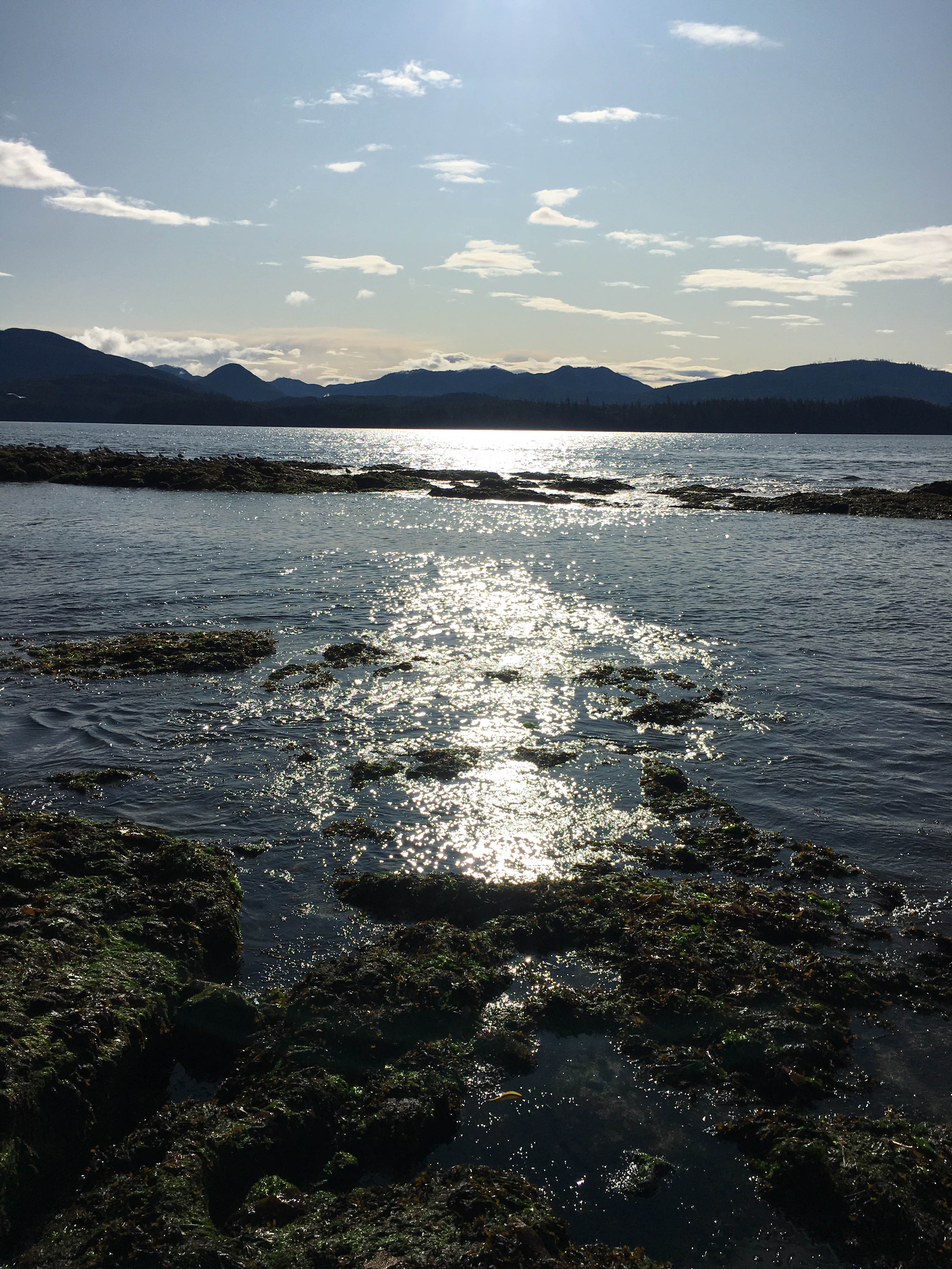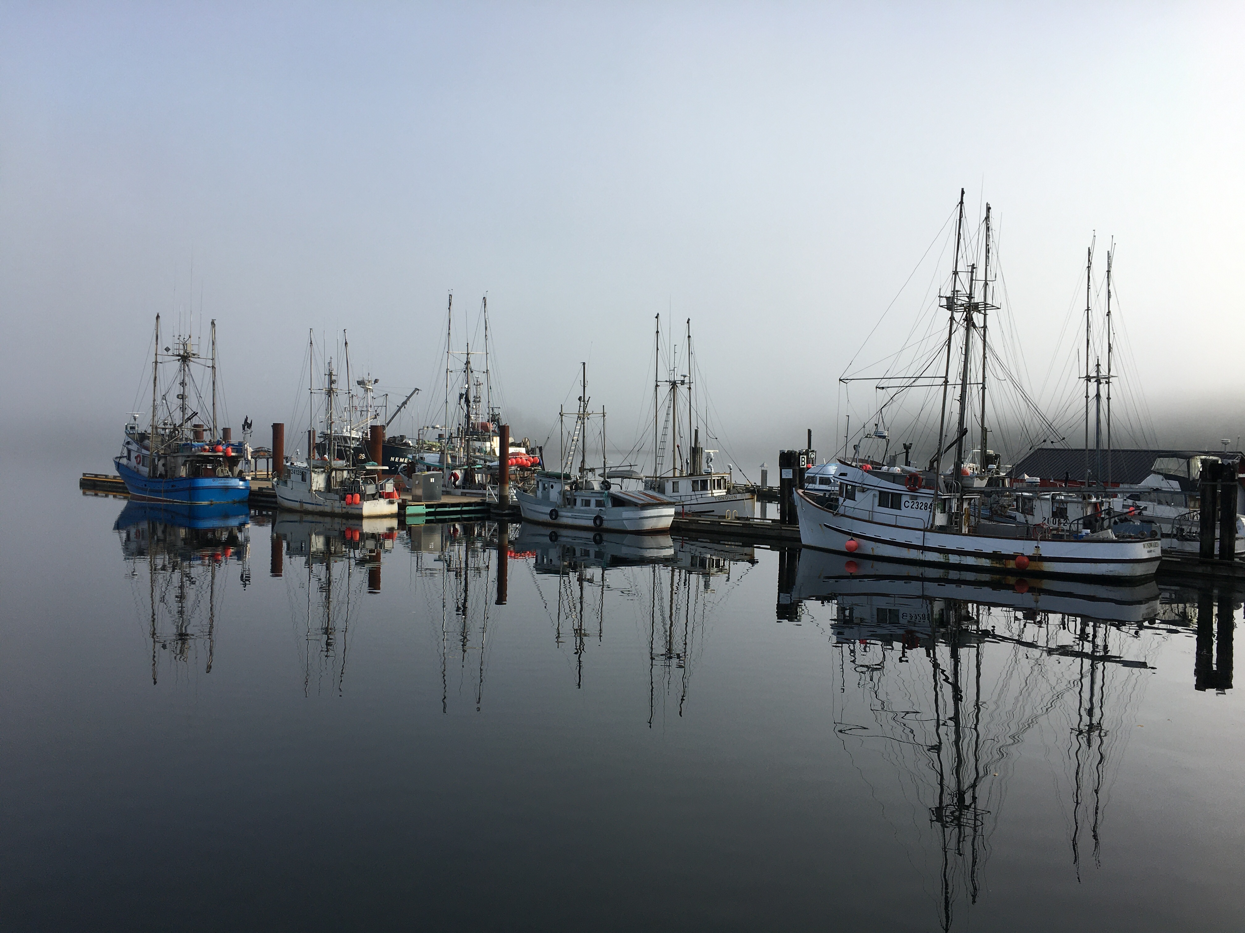 We paddled along the shore, admiring the big fishing vessels, waving at fishermen and pleasure boaters, and gradually improving our synchronized paddling. We crossed the inlet, circled Lyche Island, spotting sea stars, watching the bald eagles overhead, making our way to Port Albion, then Hitacu Dock, smiling at the wading blue herons and at another bald eagle standing in the mud flats.