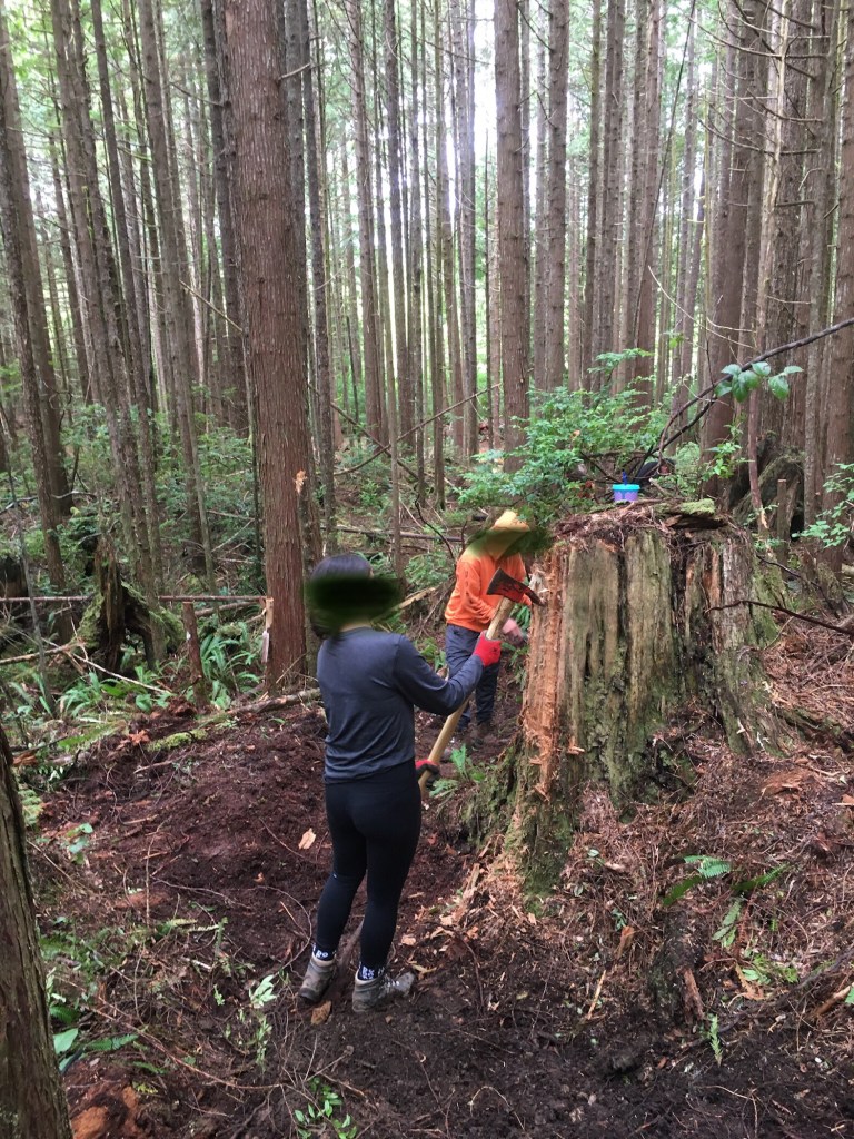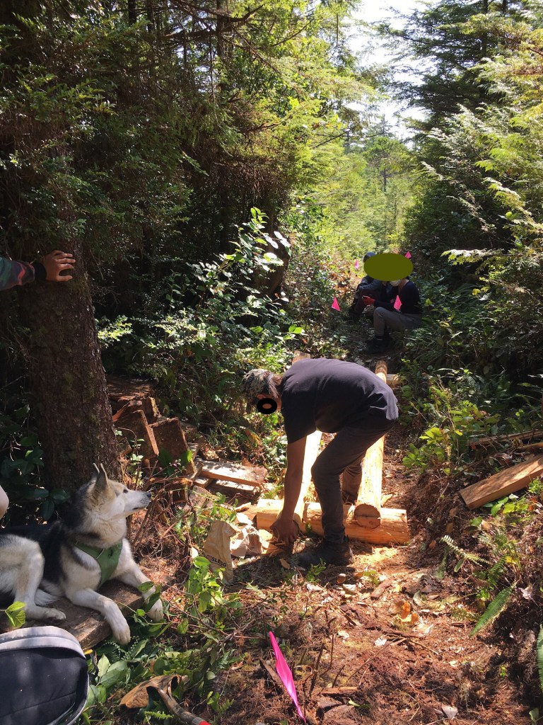 Our trail work is going along nicely, and with chainsaw skills acquired, we’ve been able to tackle some bigger items, like staircases and bridges. Trees that have been felled for safety have a new lease of life, stripped of bark to make sleepers and stringers for new sections of boardwalk bridge.