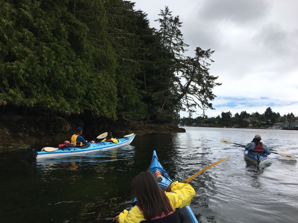 We paddled along the shore, admiring the big fishing vessels, waving at fishermen and pleasure boaters, and gradually improving our synchronized paddling. We crossed the inlet, circled Lyche Island, spotting sea stars, watching the bald eagles overhead, making our way to Port Albion, then Hitacu Dock, smiling at the wading blue herons and at another bald eagle standing in the mud flats.