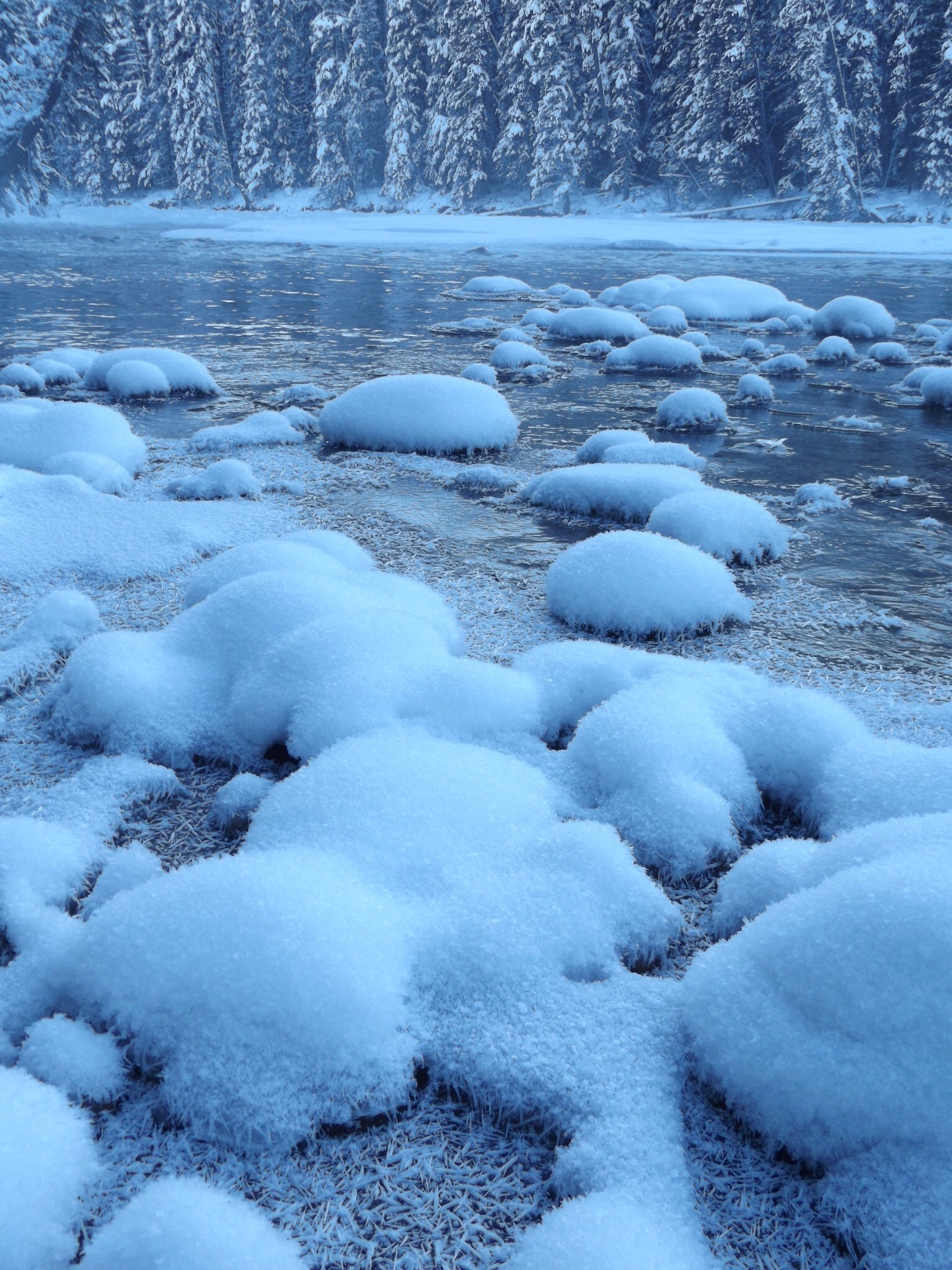 We followed a less difficult path, down to the Kicking Horse and towards the sounds of rushing and splashing water. Each riverbank was frozen, with deep snow covering ice layers. Here and there, and mostly in the middle, were stretches of flowing water. The exposed flow, tumbling and racing over blue-grey river rocks, made for some lovely sights and sounds.