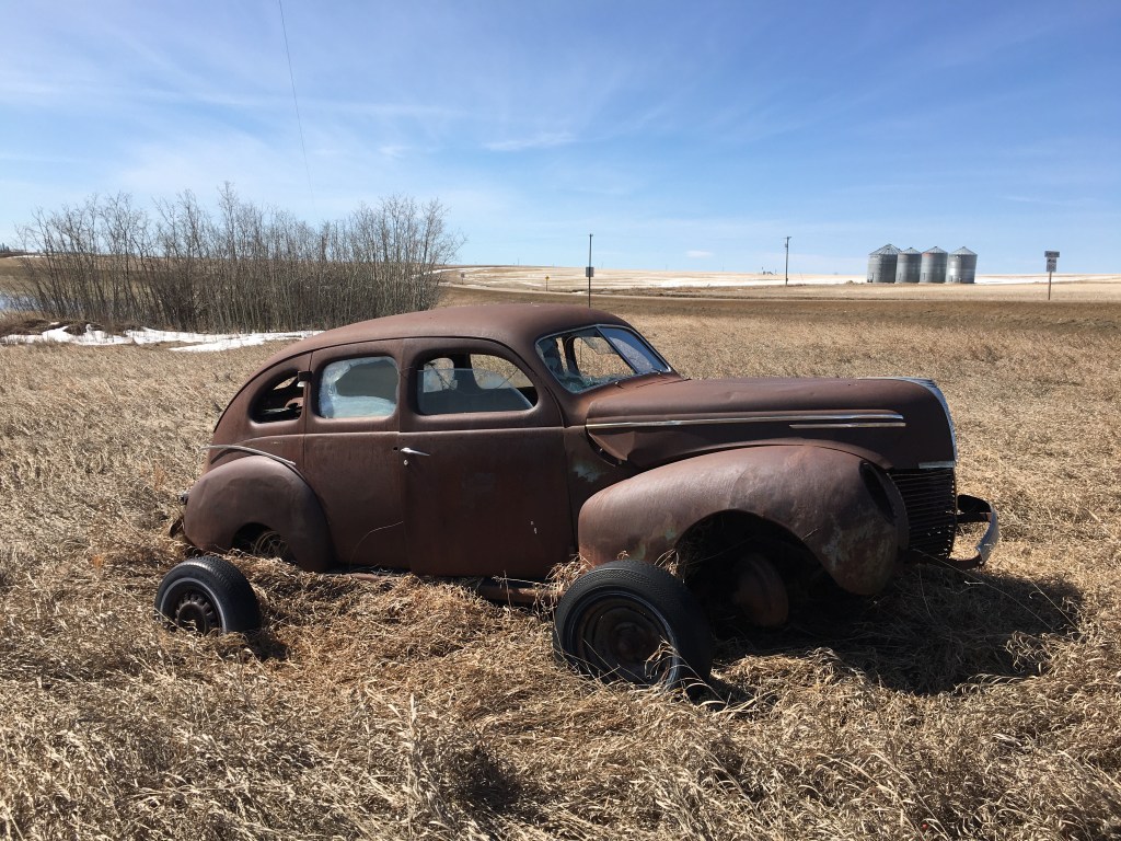 What was slightly strange was seeing a set of what looked to be reasonably ok tires, one at each wheel arch. The car looked distinctly undriveable, but maybe someone out there on the prairies has plans to ensure the Mercury isn’t in its final rusting place? That would be cool. Next time the walls close in, maybe we’ll take another spin out there, see if the car has been saved. Wheels fallen off? Doesn’t have to be a permanent state of affairs…
