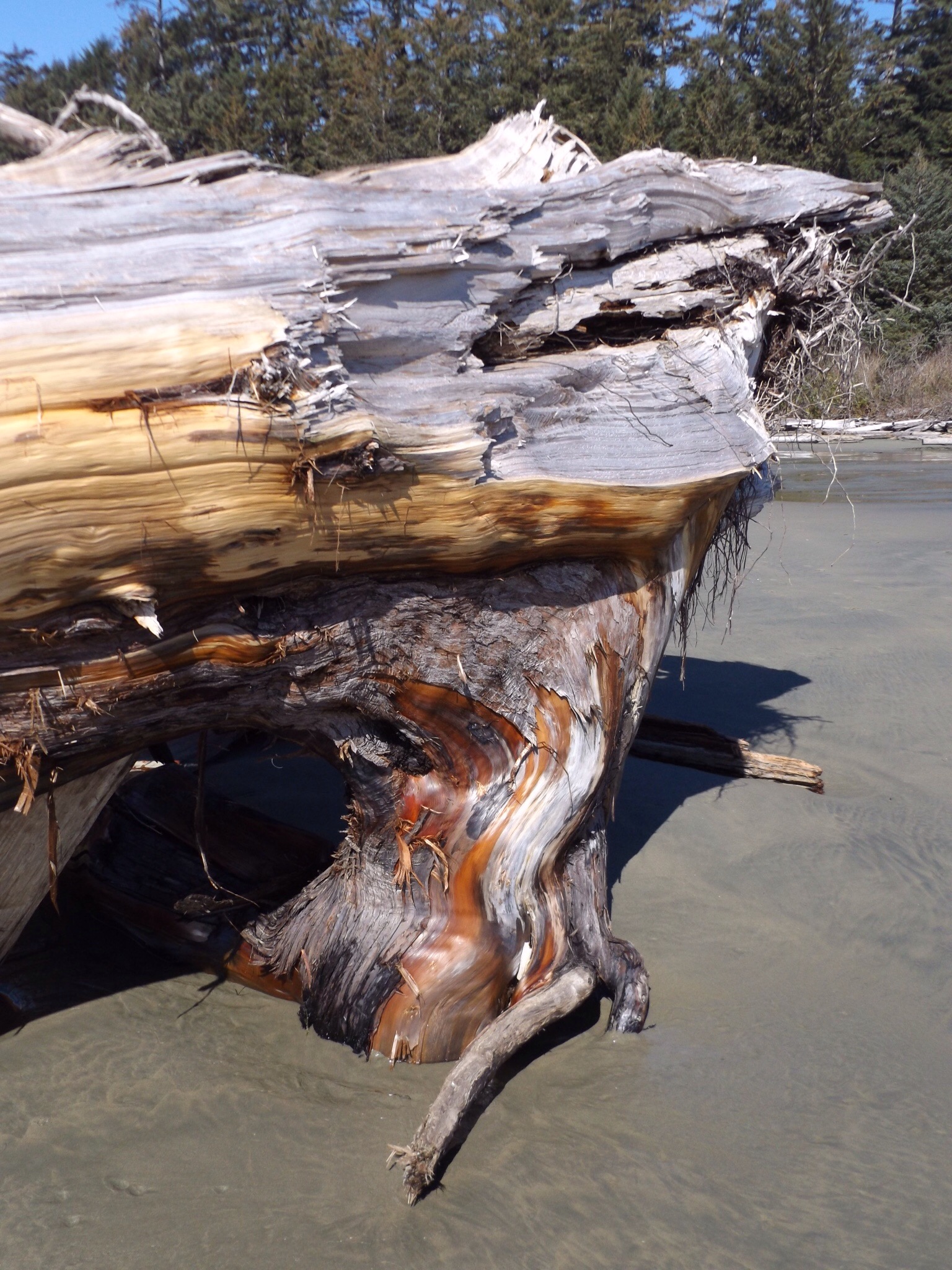 We decided to wait out the fog, believing it would lift as the morning wore on, and start our walk with a clearer view. We settled down on a log, broke into our snack supply, and saw a couple of surfers emerge onto the beach and head to the waves. They made an interesting sight through the veil of mist. Before coming to this part of the coast, if you’d said anything to me about surfing, I’d think of Hawaii and board shorts, and a beach bar serving drinks with an umbrella in. That, or my sad and exhausting attempts at surfing off the coast of the Isle of Wight (southern UK, frigid English Channel waters) many, many years ago. If there was a bar serving drinks with an umbrella in, I didn’t see it…