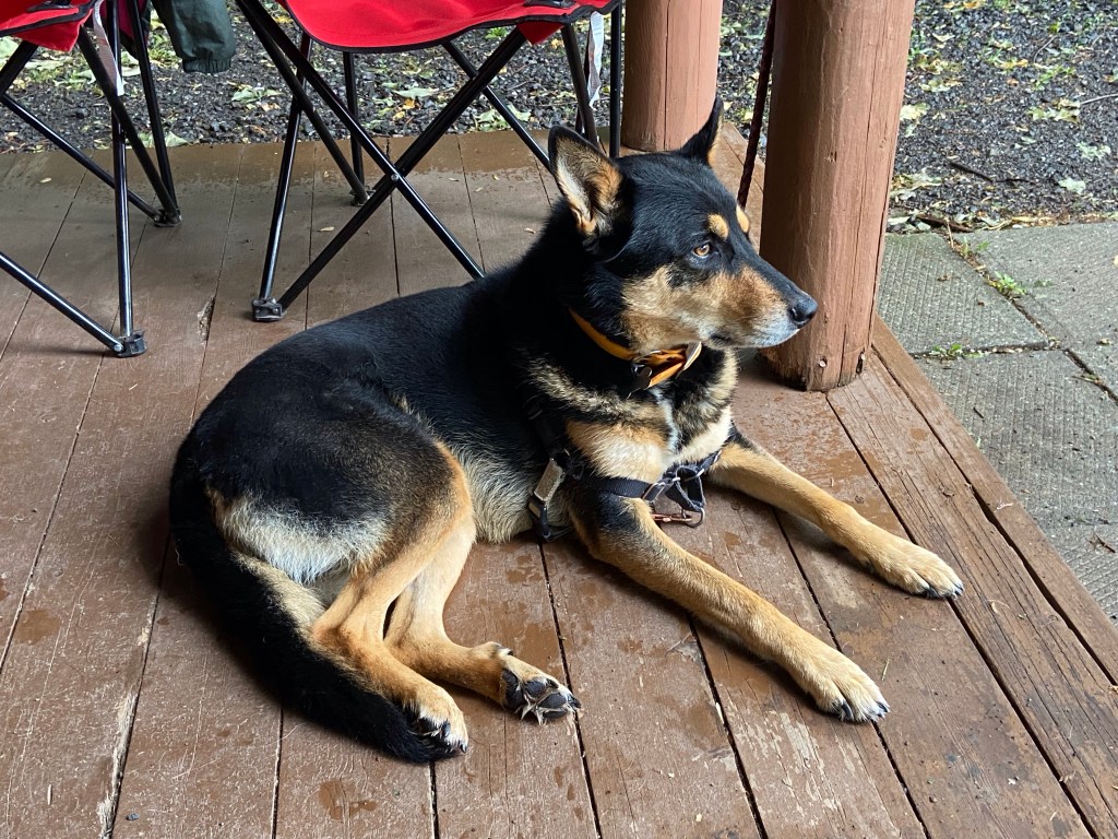 And then, just as I wasn’t ready, she stepped back then leapt forward to clear the raging torrent in one mighty bound! I was so happy she made it across, and even happier that the short leash she was on wasn’t any shorter as I narrowly avoided falling in. Now that would have been horrific – I can’t even begin to imagine the grousing had that happened. Disaster averted, I took a short step (Scout here – he meant to write “giant leap”) and followed Scout over.