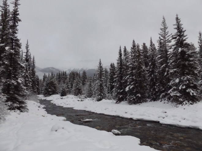 We opted to take a hike, taking delight in leaving fresh tracks across the first snow, all along Baker Creek and down to the Bow River. The snow wasn’t deep, but it was enough to change the landscape and create something new. What a relief to be out in the snow, tramping back and forth along the river bank, and recharging instead of feeling snowed under. Snowed under? No, no, we were under the snow! Winter is almost upon us, a season to embrace, and it’s almost always a perfect time to take a hike. Feels good.