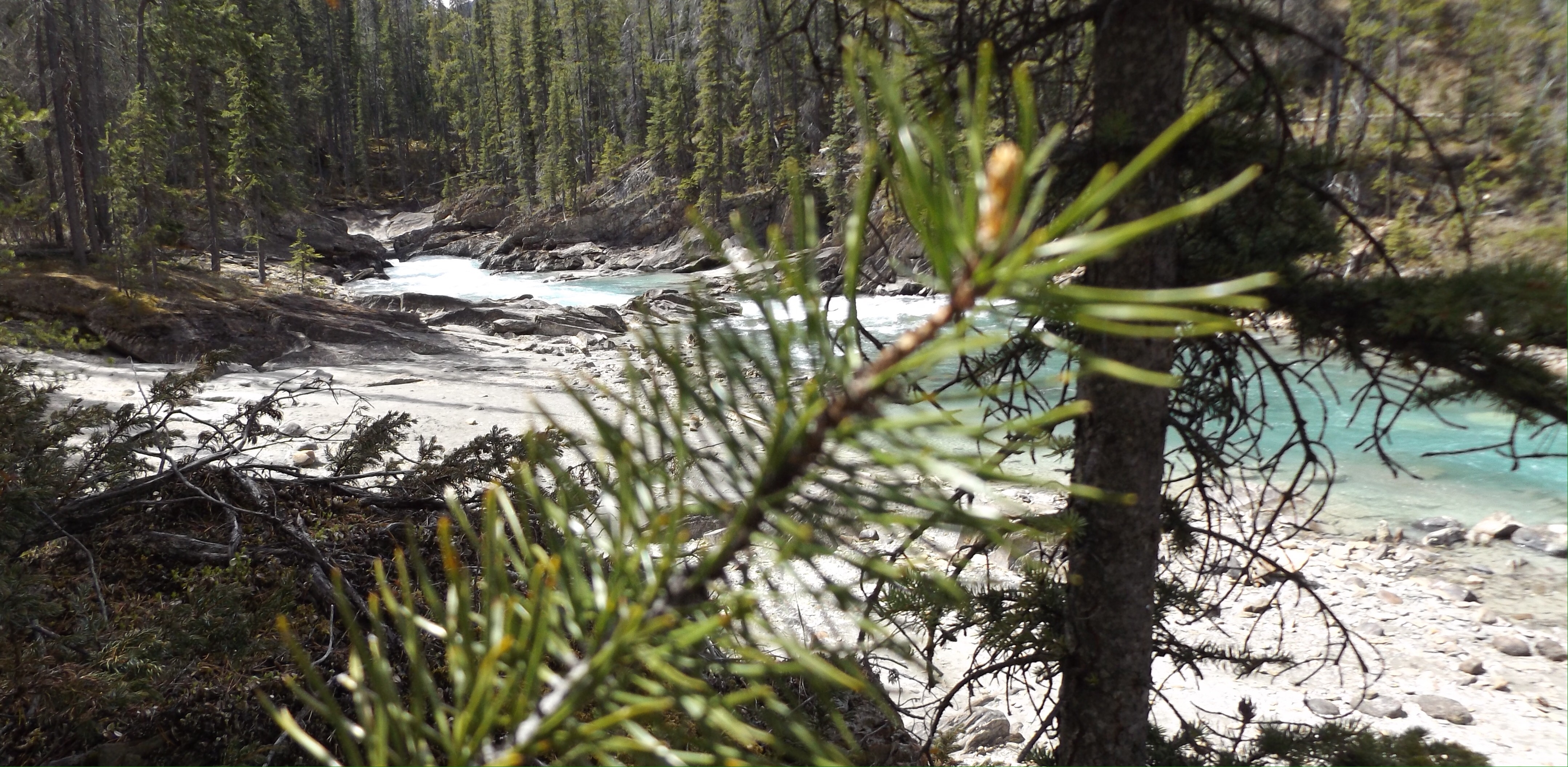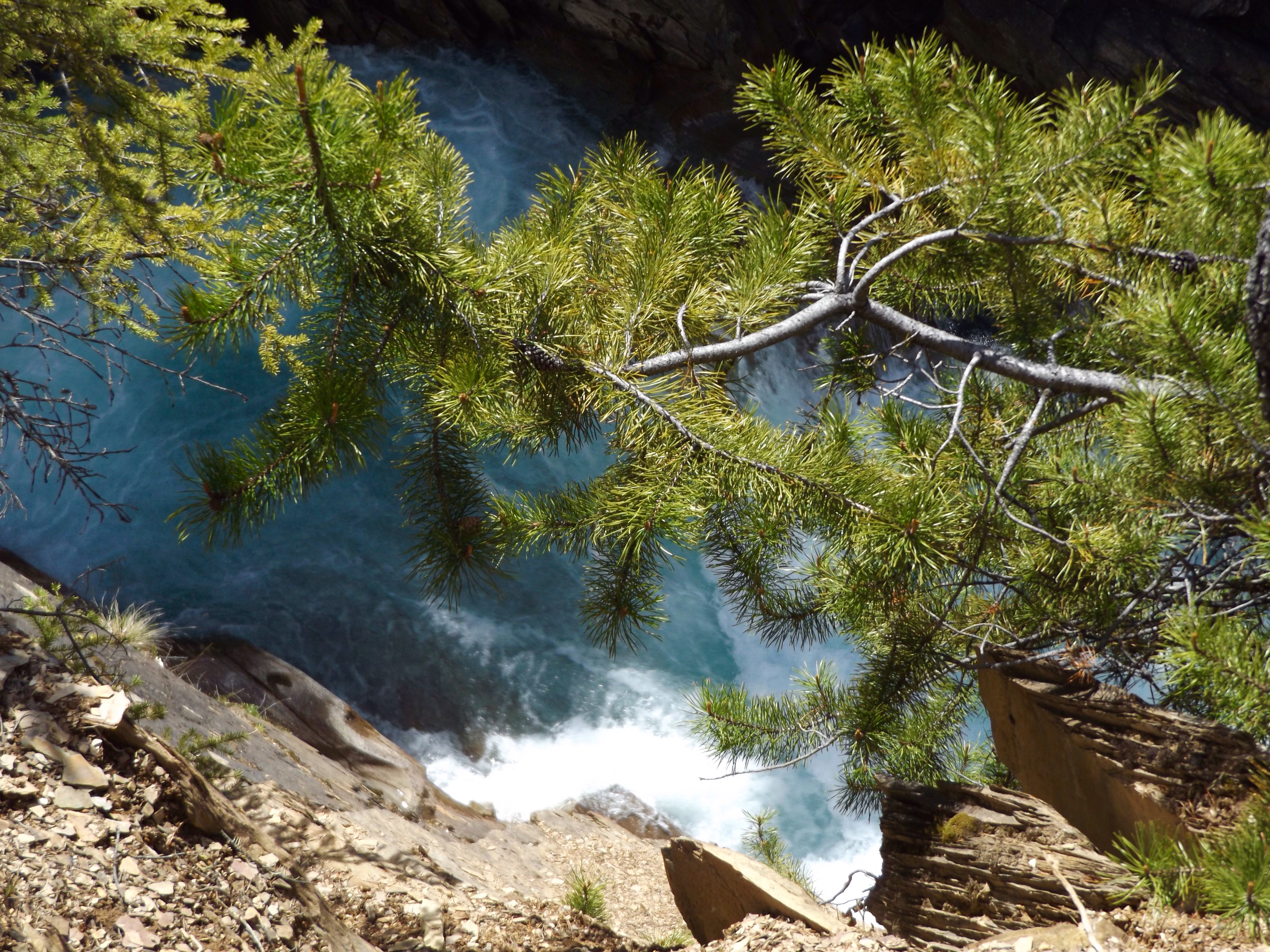 To the Kicking Horse! Lots of cars, RVs, and a tour bus in the parking lot didn’t bode well. We did the usual, and went in the opposite direction, heading down the trail and wondering as we wandered about bear activity, thinking they’d be far from the noisy crowds. The trail grew quiet as we walked away, and the sun was pleasantly warm on our happy little faces. Fresh air, blue skies, dark evergreens, and bright deciduous spring greens all worked their soothing magic as we strolled along. A few steps off the main trail onto a side trail afforded us slightly precarious but lovely views of the Kicking Horse galloping and tumbling down the valley. Sounds, scents, and sights to delight.