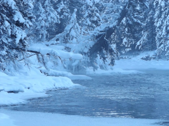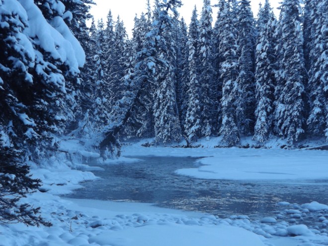Fading light, clear and clean air, sharp mountains etched against the darkening sky, and a hint of mist rising up from the river. Throw in a bottle of beer waiting for you back at the cabin, with a book by the fire, perhaps you didn’t stumble in snowshoes – or if you did, it was because it was getting dark – and that there is a fine winter afternoon.