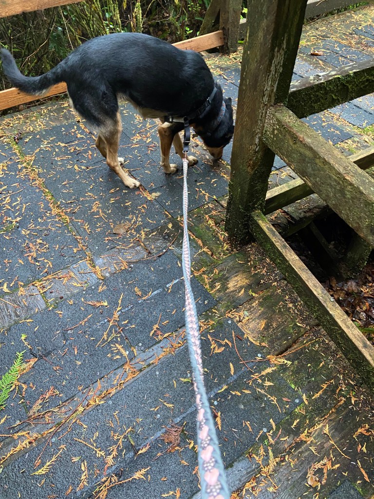 Scout can usually be relied on to jump up and be first out of the door if a walk is mentioned, but she was decidedly less enthusiastic this week as she heard the rain bouncing on the roof. In fairness, it was quite loud, and her ears are quite large. Fortunately, her curiosity always gets the better of her, or at least a fear of missing out on potential hiking snacks, and her mood always improves after the first few steps. Or bits of kibble. I find I’m the same, although I haven’t tried the kibble.
